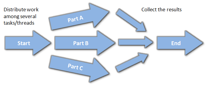 Below, there is a simple idea of the mentioned approach: you divide your computation into several separate parts, call them asynchronously and at the end collect the final result. It is up to the system/library to decide if each part is called on a dedicated thread (if available), or just run it on only one thread. This makes the solution more scalable.