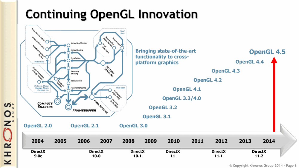 Since Siggraph 2014 is happening right now, we could expect a new version of OpenGL. And it happened! Khronos announced OpenGL 4.5! Not a major update, but still adds some nice features to the API. What about OpenGL 5.0? Is there any news here?