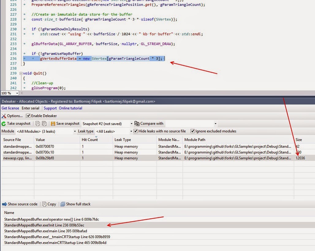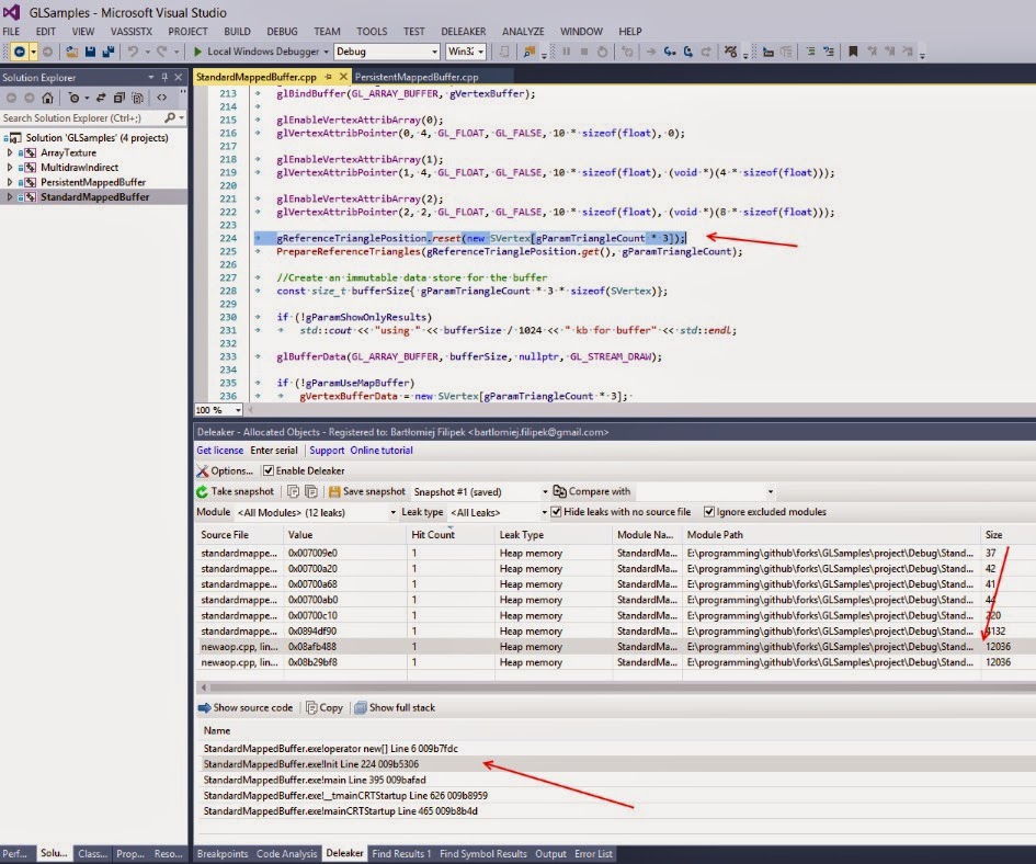 I’ve opened solution github/fenbf/GLSamples from my previous OpenGL sample. Then, I enabled Deleaker and simply ran it in Debug Mode.