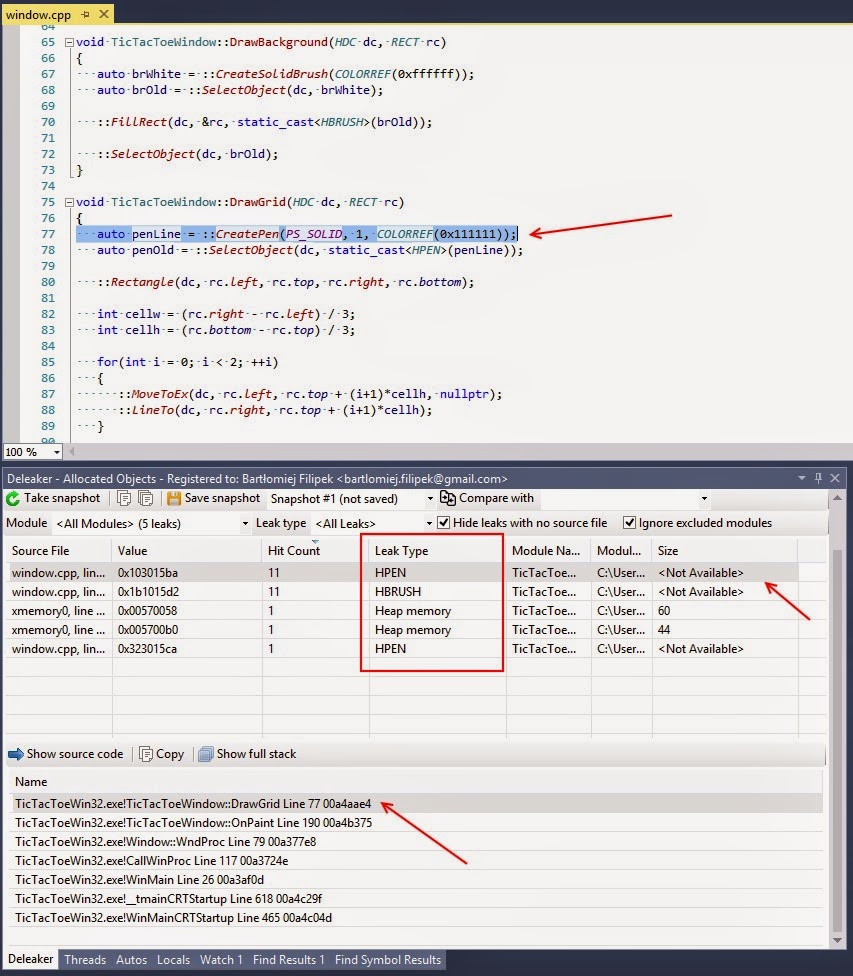 It’s quite simple: you have a list of resource allocations, with a source file, module, leak type, etc. Click on selected allocation and you will see its call stack. You can also double click on a call stack entry and go to a particular line of code that is responsible for the allocation.