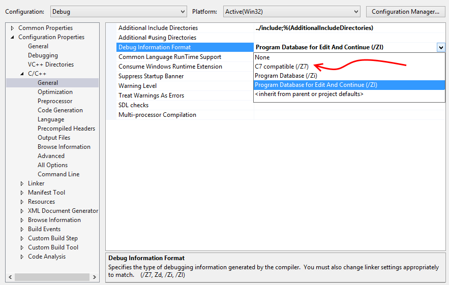 We have also two ways of building a program database: generate a single database for the whole project, or store debug information inside each compilation unit. By default Visual Studio uses the first approach (new format version) and the second is called “C7 Compatible Format” (old format).