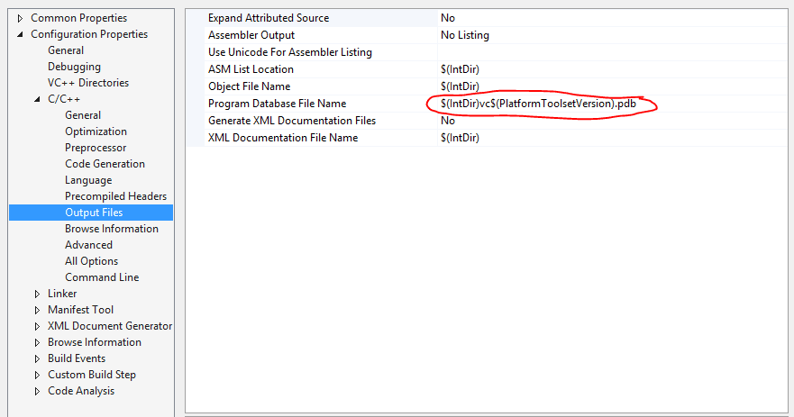 Project Property Pages -> C++ -> Output Files -> Program Database File Name