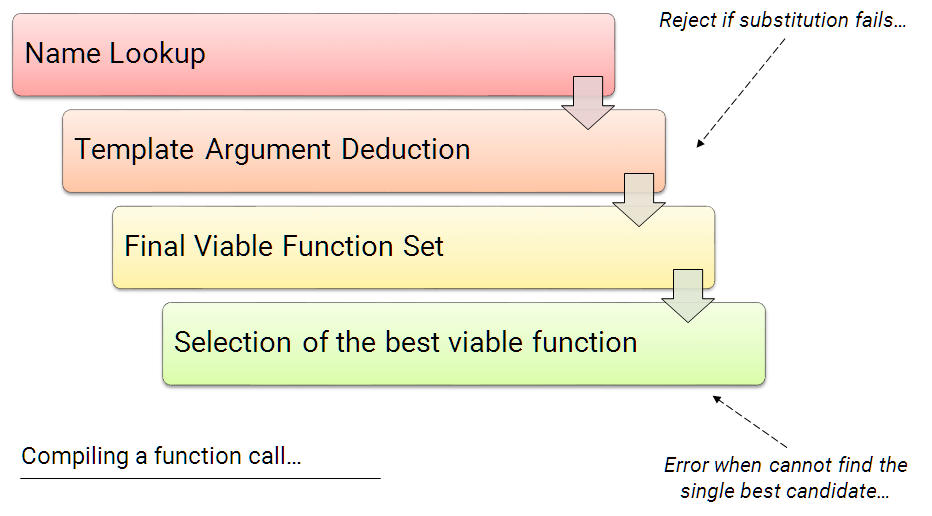 - At the end we have a list of viable functions that can be used for the specific call. If this set is empty, then the compilation fails. If more than one function is chosen, we have an ambiguity. In general, the candidate function, whose parameters match the arguments most closely is the one that is called.