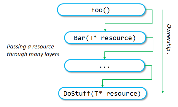 The above code is as usually very simple. In a real example, the ownership can be passed multiple levels down in the call stack hierarchy. The pointer might be even stored in some object that lives much longer than the ‘creation’ point. We could invent lots of examples here. See the picture below that shows many layers where the resource might be processed and eventually released.