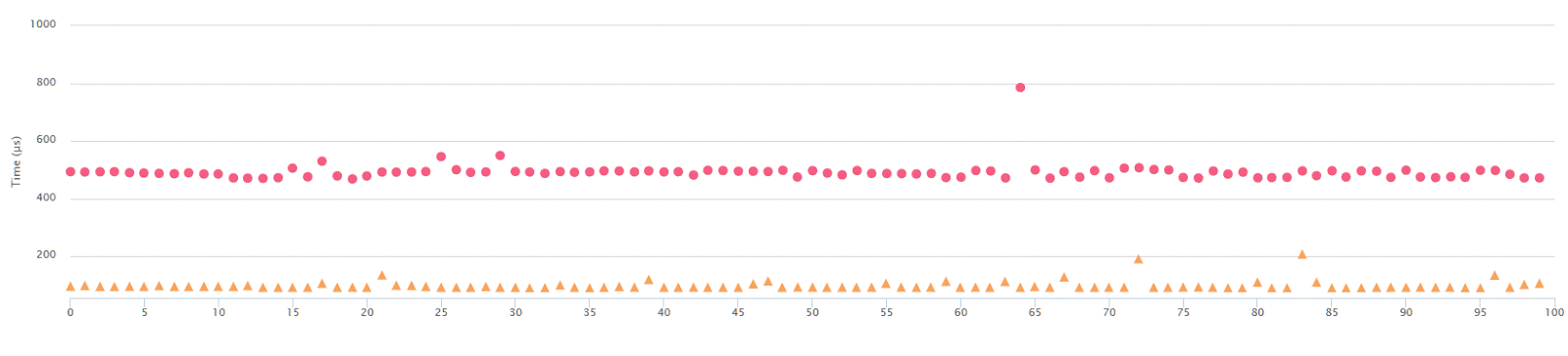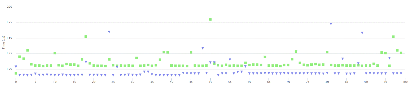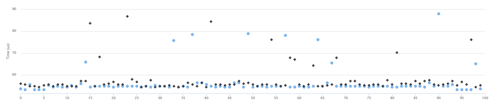 The chart shows timings for 100 samples taken from running the code,
