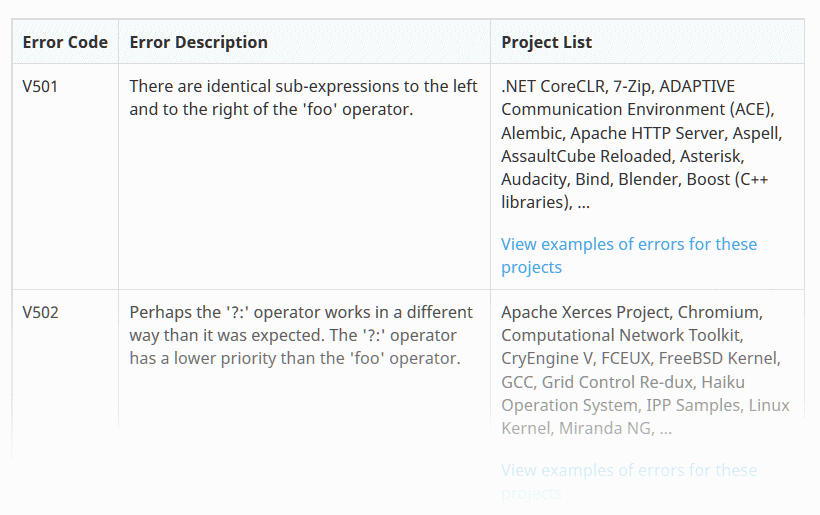As one of their promotional strategies, the PVS-Studio Team analyses a lot of open source projects. They’ve managed to build a large list of common bugs and error-prone patterns. The approach created “the database of bugs.”