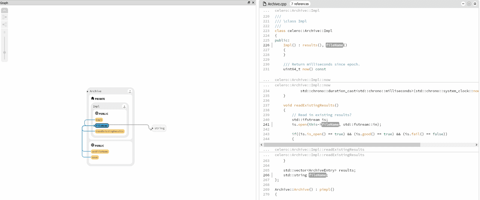 I’m impressed with this view! The blue lines on the diagram represent where a field is being used, plus we get a ‘snippet’ view in the source editor. That way I can immediately read the code in the relevant places.