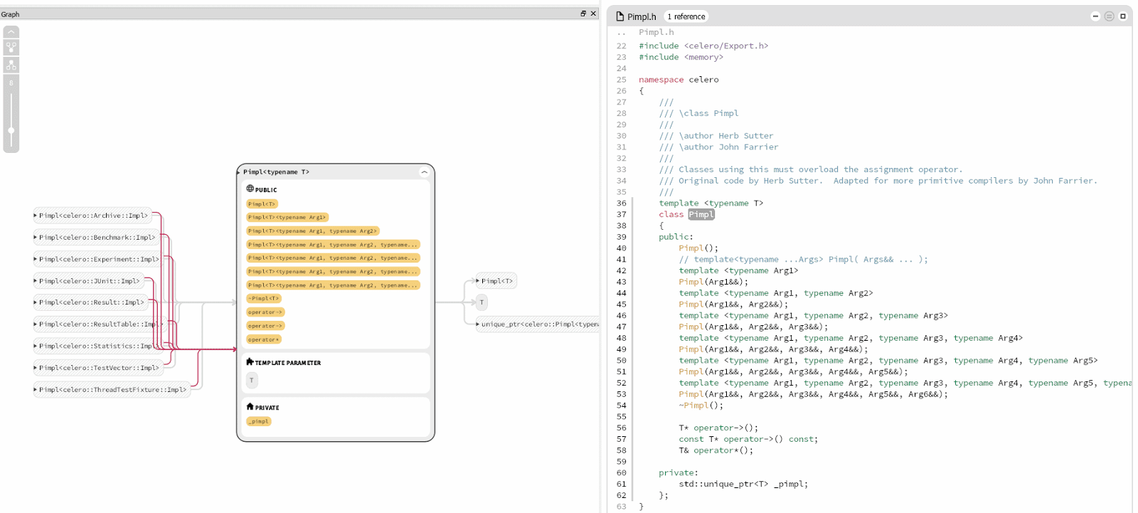 - Graph - interactive and dynamic graph built from the selected symbol name. It can centre around a class, file, macro, function… or even a template parameter.