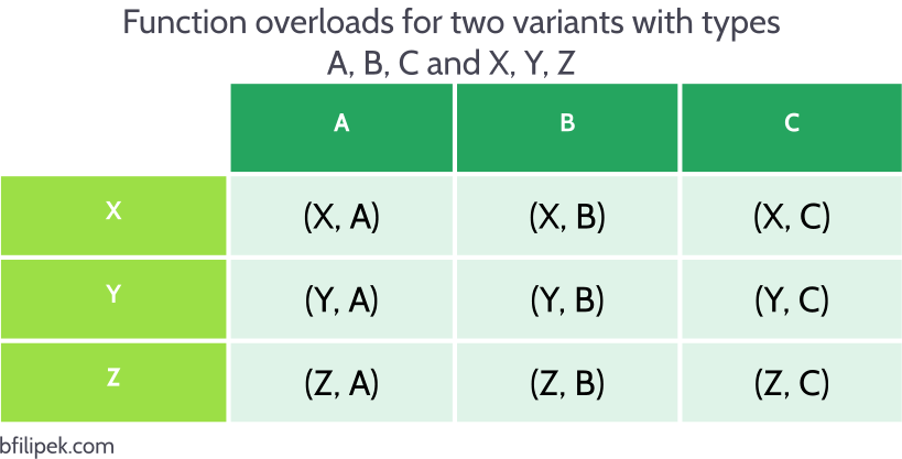 As you see you have to provide overloads for all of the combinations (N-cartesian product) of the possible types that can appear in a function.